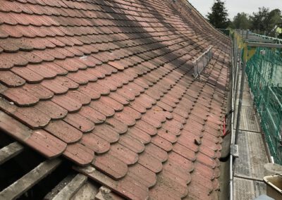 Nachdem die Deckunterlage auf einer Fläche von 250 qm ausgeglichen wurde, konnte das Dach der Turnhalle mit Bibern entsprechend den Forderungen des Denkmalschutzes eingedeckt werden.