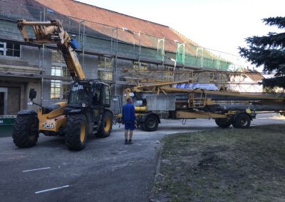 Somit war der Einsatz eines Kranes unabdinglich. Das Heranschaffen des Krans gestaltete sich aufgrund der schlechten Zuwegung jedoch äußerst schwierig. Mit äußerster Präzision zog unser Geselle Daniel den Kran an Ort und Stelle, sodass uns der Transport von Alt- und Neumaterialien um ein Vielfaches erleichtert wurde.